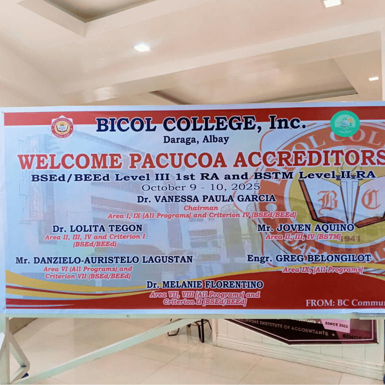 Bicol College is pleased to announce the successful conduct of the PACUCOA Accreditation Visit for its BEED, BSED, and BSTM programs. The BEED and BSED programs underwent evaluation for Level III, First Reaccreditation, while the BSTM program was evaluated for Level II, First Reaccreditation.
